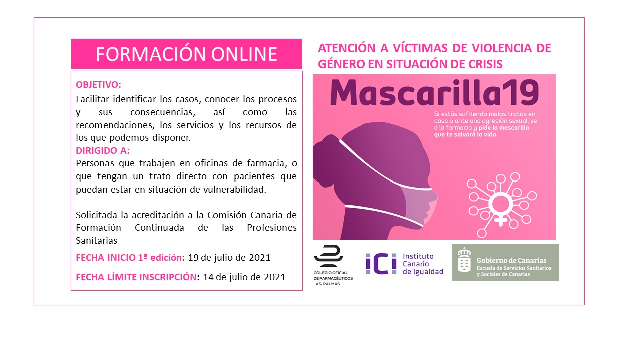 La puesta en marcha de «Mascarilla 19» supuso un paso importante en la atención a las víctimas de violencia de género a nivel regional, nacional e internacional. Desde el convencimiento de la necesidad de prestar este servicio tan necesario, y en colaboración con el Instituto Canario de Igualdad, te invitamos a participar en un curso de formación específico, a través de la ESSSCAN (Escuela de Servicios Sanitarios de Canarias), para el que hay previsto realizar 12 ediciones.