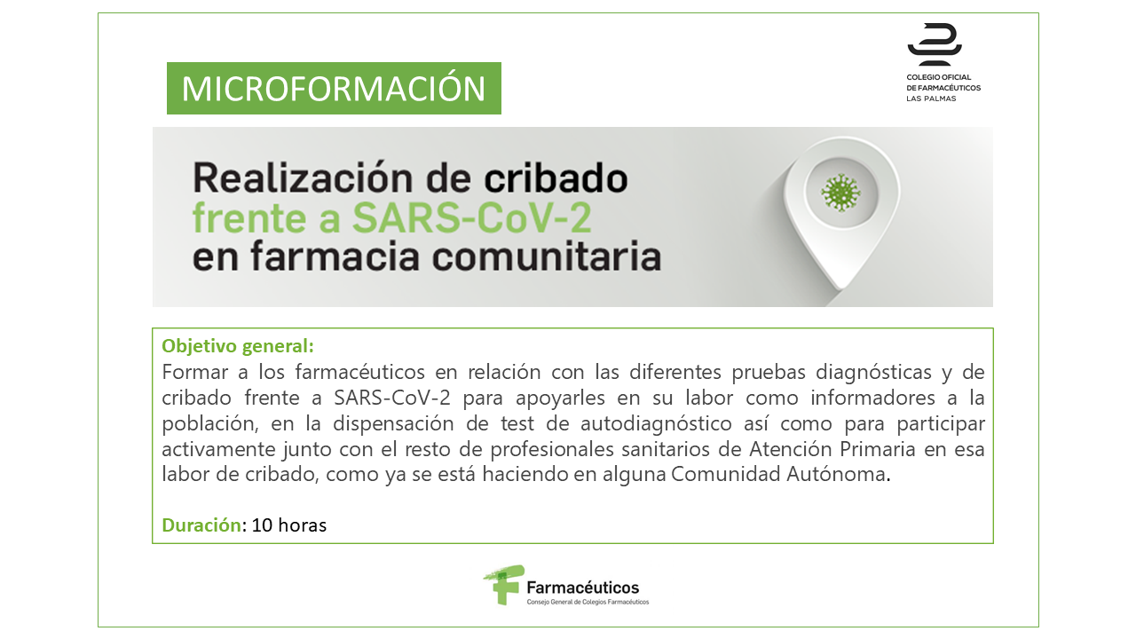 El objetivo general de esta actividad formativa es formar a los farmacéuticos en relación con las diferentes pruebas diagnósticas y de cribado frente a SARS-CoV-2 para apoyarles en su labor como informadores a la población, en la dispensación de test de autodiagnóstico así como para participar activamente junto con el resto de profesionales sanitarios de Atención Primaria en esa labor de cribado, como ya se está haciendo en alguna Comunidad Autónoma.
