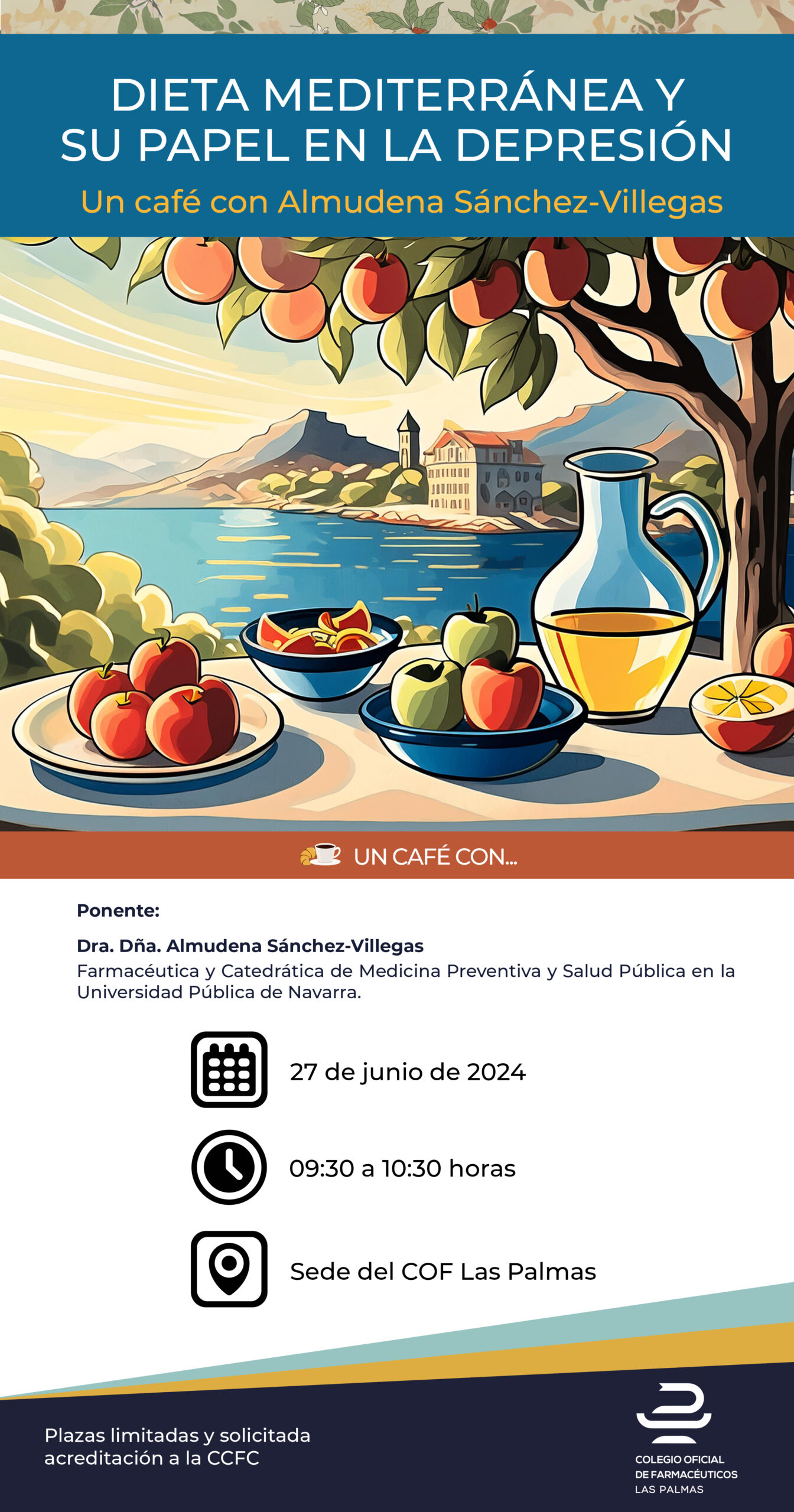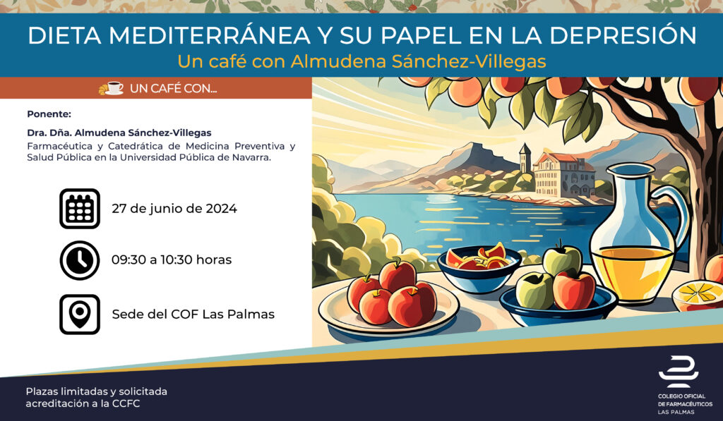 La Vocalía Docencia e Investigación junto con la colaboración de las Vocalías de Salud Pública y Administración, Alimentación y Análisis Clínicos, celebrarán el próximo día 27 de junio en horario de 9:30 a 10:30 horas, en la Sede Colegial, la conferencia Dieta Mediterránea y su papel en la depresión, impartida por la Dra. Dña. Almudena Sánchez Villegas, catedrática de Medicina Preventiva y Salud Pública en la Universidad Pública de Navarra.
