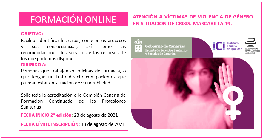 Te invitamos a participar en la segunda edición del curso titulado «Atención a Víctimas de Violencia de Género en situación de crisis. Mascarilla 19», a través de la ESSSCAN (Escuela de Servicios Sanitarios de Canarias y dentro de nuestra colaboración con el Instituto Canario de Igualdad, que como sabes, ha supuesto un paso importante en la atención a las víctimas de violencia de género a nivel regional, nacional e internacional.