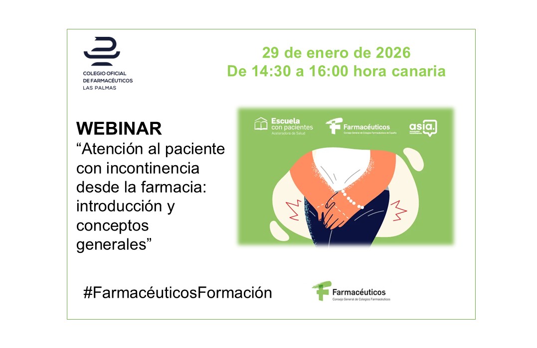 El próximo día 29 de enero, de 14:30 a 16:00 horas (hora canaria), el Consejo General de Farmacéuticos, a iniciativa de las Vocalías Nacionales de Farmacéuticos Analistas Clínicos y de Alimentación, celebrará la sesión formativa denominada “Atención al paciente con incontinencia desde la farmacia: introducción y conceptos generales”.