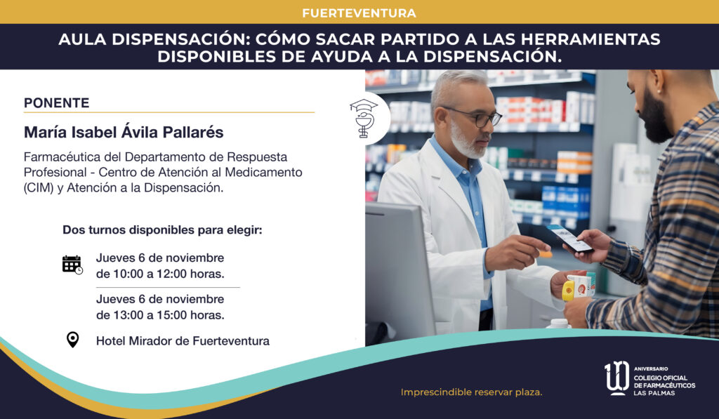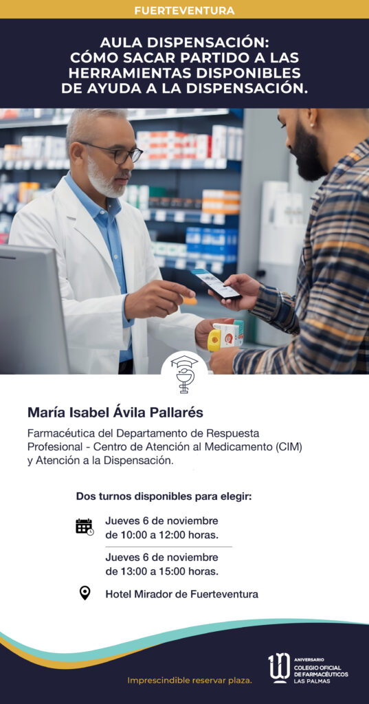 La formación será impartida por María Isabel Ávila Pallarés, Farmacéutica del Departamento de Respuesta Profesional - Centro de Información al Medicamento (CIM) y Atención a la Dispensación del Colegio Oficial de Farmacéuticos de Las Palmas.