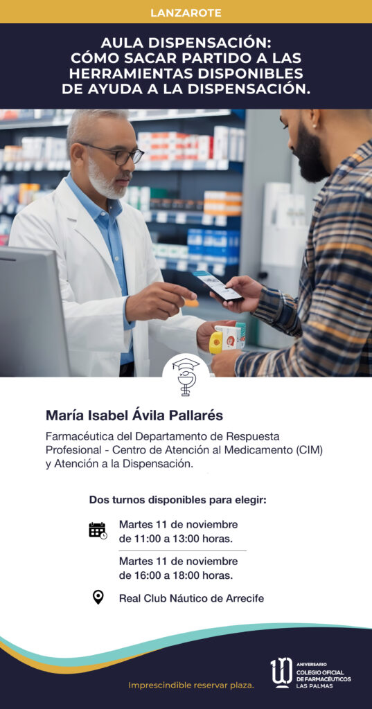 La formación será impartida por María Isabel Ávila Pallarés, Farmacéutica del Departamento de Respuesta Profesional - Centro de Información al Medicamento (CIM) y Atención a la Dispensación del Colegio Oficial de Farmacéuticos de Las Palmas.