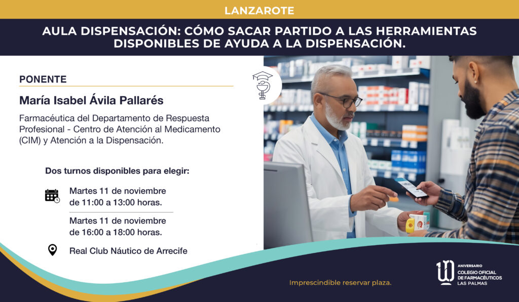 La formación será impartida por María Isabel Ávila Pallarés, Farmacéutica del Departamento de Respuesta Profesional - Centro de Información al Medicamento (CIM) y Atención a la Dispensación del Colegio Oficial de Farmacéuticos de Las Palmas.