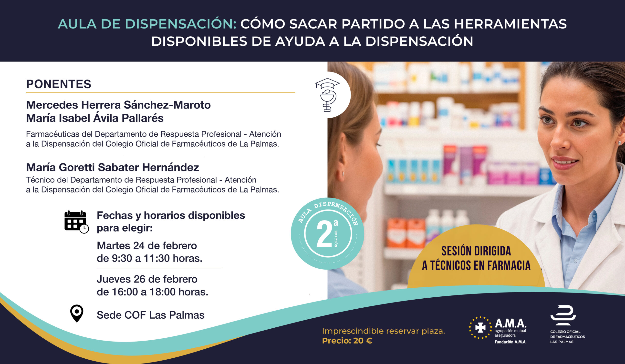La formación será impartida por María Isabel Ávila Pallarés, Mercedes Herrera Sánchez-Maroto Farmacéuticas del departamento de Respuesta Profesional y Atención a la Dispensación y María Goretti Sabater Hernández, técnico del departamento de Respuesta Profesional y Atención a la Dispensación del Colegio Oficial de Farmacéuticos de Las Palmas.