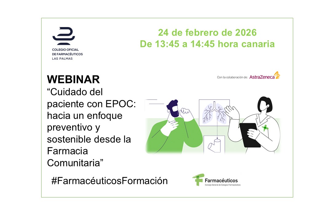 El próximo día 24 de febrero, de 13:45 a 14:45 horas (hora canaria), el Consejo General de Farmacéuticos, a iniciativa de las Vocalías Nacionales de Farmacéuticos Analistas Clínicos y de Alimentación, celebrará la sesión formativa denominada “Cuidado del paciente con EPOC: hacia un enfoque preventivo y sostenible desde la farmacia comunitaria”.