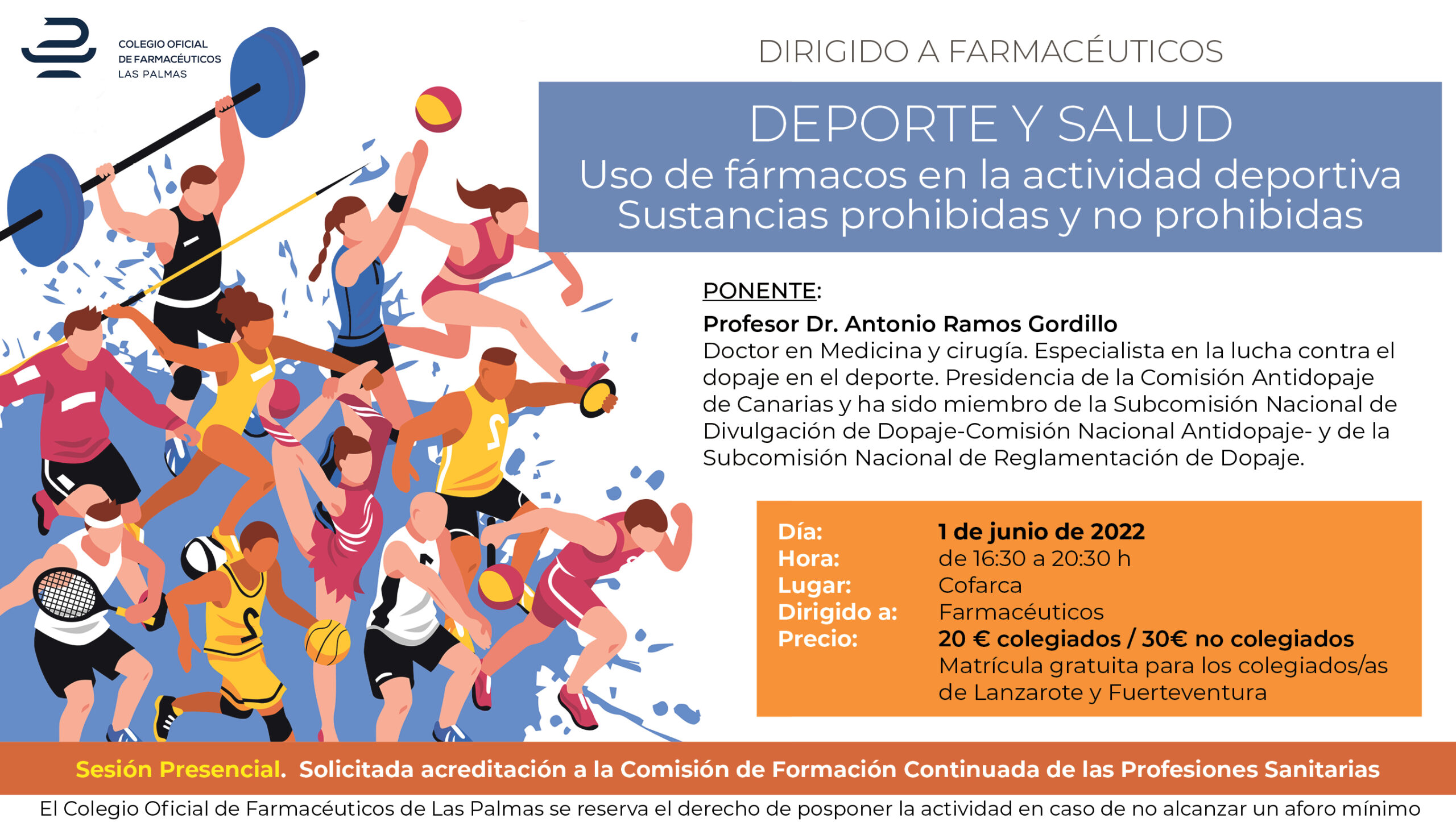 Prof. Dr. Antonio Ramos Gordillo. Doctor en Medicina y cirugía. Especialista en la lucha contra el dopaje en el deporte. Presidencia de la Comisión Antidopaje de Canarias. Ha sido miembro de la Subcomisión Nacional de Divulgación de Dopaje-Comisión Nacional Antidopaje- y de la Subcomisión Nacional de Reglamentación de Dopaje. Autor de diversos libros sobre dopaje y deporte, actividad física y salud y sobre Medicina de la Educación Física y el Deporte. Premio de Canarias al Deporte 2015, que concede el Gobierno de Canarias. Medalla de Plata al Mérito Deportivo 2007 que otorga el Consejo Superior de Deportes y distinción Roque Nublo de Plata al Deporte del Cabildo Insular de Gran Canaria.