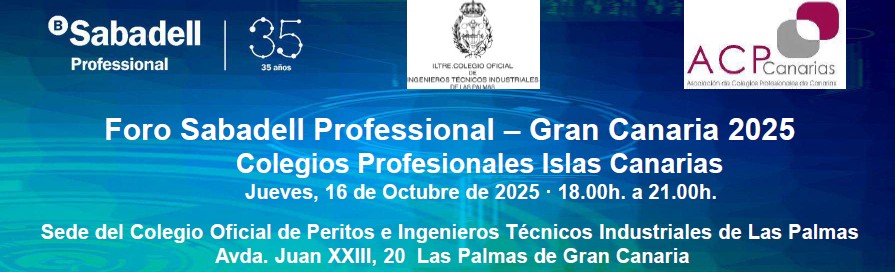 El próximo jueves 16 de octubre, de 18:00 a 21:00 horas, se celebrará el Foro Sabadell Professional Gran Canaria 2025, un evento organizado por los Colegios Profesionales de las Islas Canarias en colaboración con Banco Sabadell. La cita tendrá lugar en la sede del Colegio Oficial de Peritos e Ingenieros Técnicos Industriales de Las Palmas de Gran Canaria.