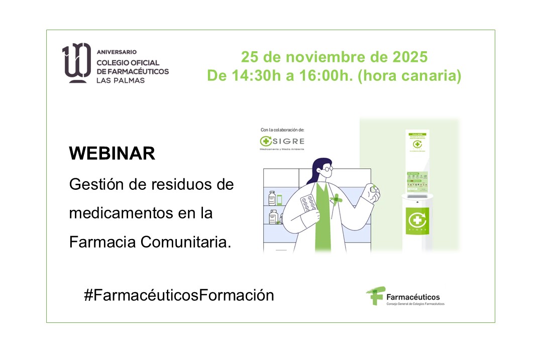 El próximo día 25 de noviembre, de 14:30 a 16:00 horas (hora canaria), el Consejo General de Farmacéuticos, a iniciativa de la Vocalía Nacional de Oficina de Farmacia, va a celebrar la sesión formativa denominada “Gestión de residuos de medicamentos en la Farmacia Comunitaria”.