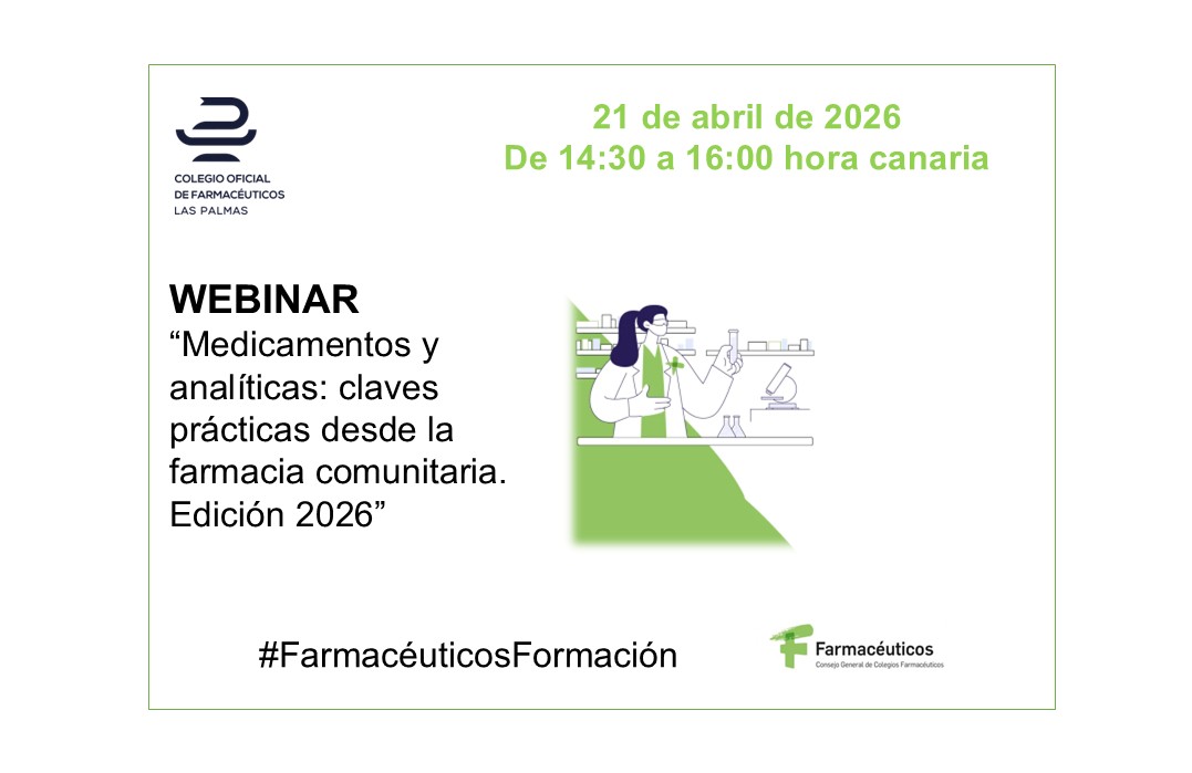 El próximo día 21 de abril, de 14:30 a 16:00 horas (hora canaria), el Consejo General de Farmacéuticos, a iniciativa de las Vocalías Nacionales de Farmacéuticos Analistas Clínicos y de Alimentación, celebrará la sesión formativa denominada “Medicamentos y analíticas: claves prácticas desde la farmacia comunitaria. Edición 2026”.