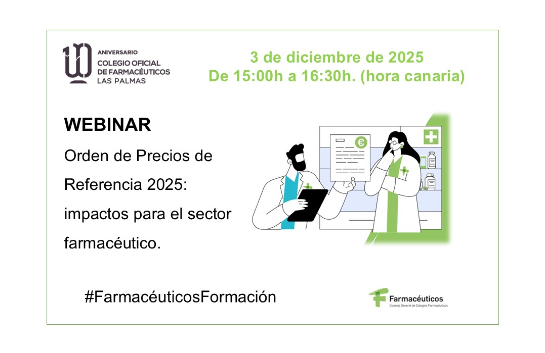 El próximo 3 de diciembre, entre las 15:00 y las 16:30 h (hora canaria), el Consejo General de Colegios Oficiales de Farmacéuticos, a través de su Vocalía Nacional de Farmacéuticos en la Industria, celebrará la sesión formativa online Orden de Precios de Referencia 2025: impactos para el sector farmacéutico, que está dirigida a aquellos farmacéuticos interesados.