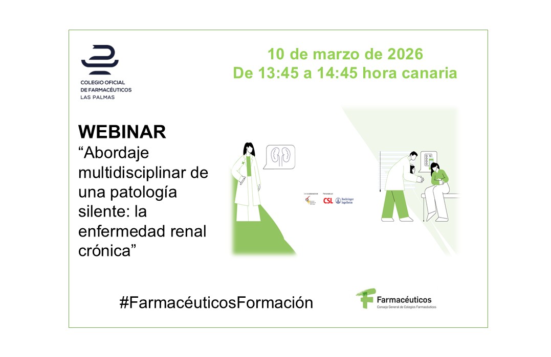 El próximo día 10 de marzo, de 13:45 a 14:45 horas (hora canaria), el Consejo General de Farmacéuticos, a iniciativa de las Vocalías Nacionales de Farmacéuticos Analistas Clínicos y de Alimentación, celebrará la sesión formativa denominada “SESIÓN FORMATIVA ONLINE. ABORDAJE MULTIDISCIPLINAR DE UNA PATOLOGÍA SILENTE: LA ENFERMEDAD RENAL CRÓNICA”.