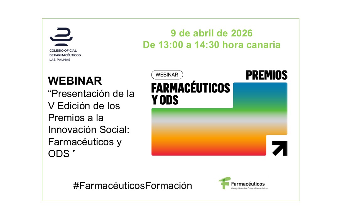 El próximo día 9 de abril, de 13:00 a 14:30 horas (hora canaria), el Consejo General de Farmacéuticos, celebrará la sesión formativa denominada “V edición de los Premios a la Innovación Social: Farmacéuticos y ODS”.