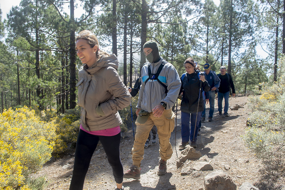 Conscientes de que se caminaba sobre la linde entre la parte de la isla más antigua y la parte más nueva, geológicamente hablando, antes de comenzar el descenso del Camino de La Plata, los senderistas pudieron contemplar las impresionantes estructuras nacidas de las primeras explosiones volcánicas y compararlas con el paisaje que nos acompañó durante el trayecto en guagua hasta el pico.