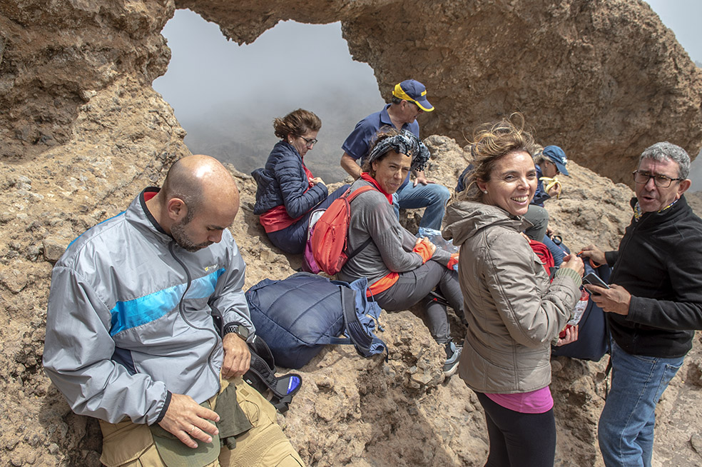 La ruta se desarrolló como estaba previsto, con paradas puntuales para el reagrupamiento y con otras más largas para el descanso. Entre éstas, como no, cabe destacar la que se hizo junto a la Ventana del Nublo, en donde se tuvo oportunidad de reponer fuerzas pero no de disfrutar de las vistas, ya que la meseta del Nublo se encontraba cubierta de nubes que dejaban a la vista las impresionantes paredes de Ayacata, haciéndolas más infinitas.