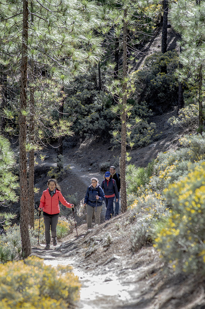 Conscientes de que se caminaba sobre la linde entre la parte de la isla más antigua y la parte más nueva, geológicamente hablando, antes de comenzar el descenso del Camino de La Plata, los senderistas pudieron contemplar las impresionantes estructuras nacidas de las primeras explosiones volcánicas y compararlas con el paisaje que nos acompañó durante el trayecto en guagua hasta el pico.