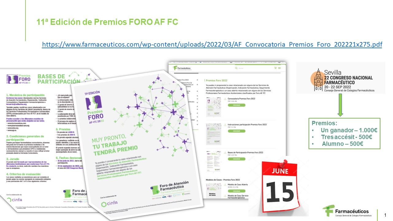 Estos premios reconocen la actividad asistencial en la práctica real y están dotados profesionalmente, con la publicación de los mejores casos, y económicamente con 1.000€ para el ganador, 500€ para tres accésits y 500€ para el ganador en la modalidad estudiante. El ganador recibirá premio, tanto económico como profesional, el 20 de septiembre en el seno del Congreso Nacional Farmacéutico, en Sevilla, contando con la colaboración de laboratorios Cinfa.