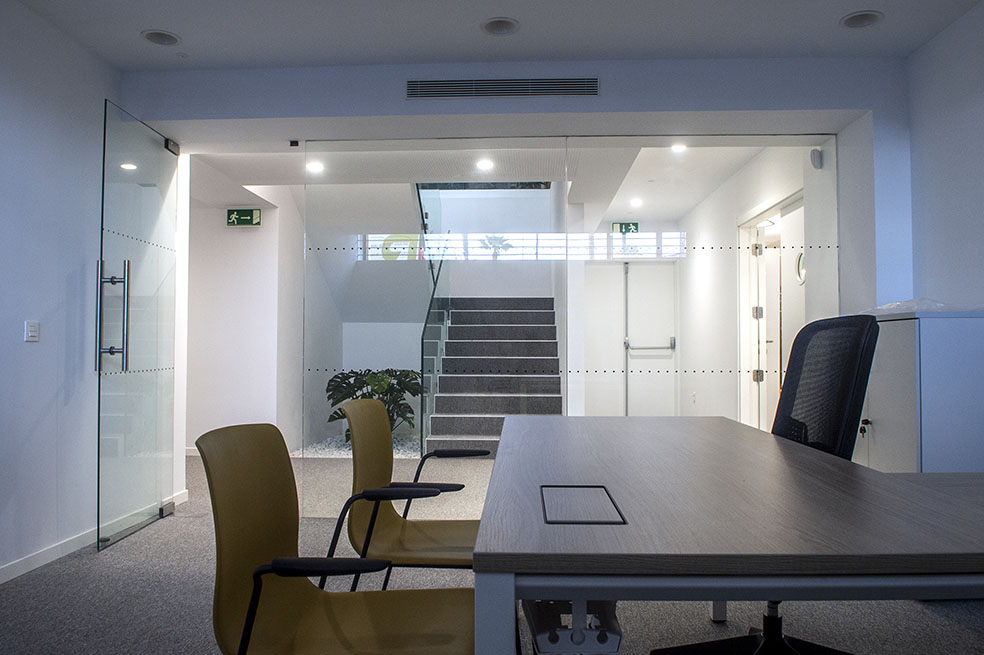 Con este planteamiento, no debe extrañarnos la luminosidad de la planta principal, en donde se ubican los entornos de trabajo, el vestíbulo, el salón de actos, las salas de formación y las de reuniones. La planta baja, donde la luz natural casi no entra, está diseñada para acoger espacios de almacén, equipos informáticos, equipo de aire acondicionado y un despacho de reuniones.